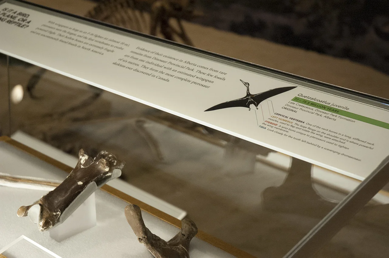I chose new colours, typefaces, and panel material to improve legibility within the dark gallery space. Graphic timelines were also added, running along the bottom of panels to help visitors place themselves in the correct geologic time period as they walk along the exhibit path. Specimen labels were colour-coded to coordinate with these timelines.