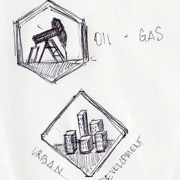 The 3D designer (Collin Hnetka) and I collaborated to create a visual identity that is clean and modern. The heavy, geometric motifs, rectilinear shapes, and pops of bright colour are meant to reflect the themes of industry, machinery, and cutting-edge science.